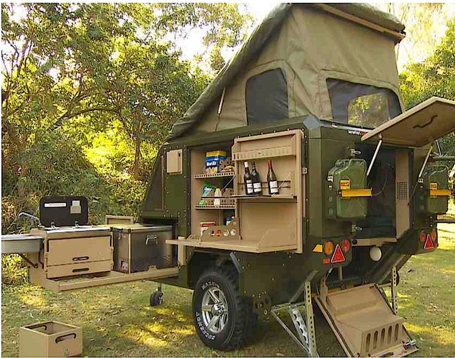 When all set up, there are tarps and flys and all kinds of protection from bugs and rain. Since it is Australia and can be dusty, every door is gasketed but there is also a fan that pressurizes the interior so that dust can’t get sucked in.