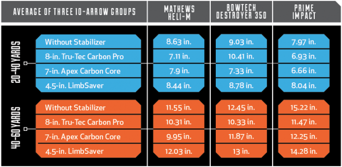Stabilizers had the most effect on accuracy and noise reduction on a 3.5-pound Mathews Heli-M and the least effect on a 4.5-pound Prime Impact. In between was the 4.3-pound Bowtech.