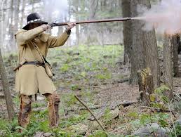 Primitive muzzleloader aficionados must choose between either a flintlock or a caplock ignition system. A flintlock is the more primitive technology, popular from the time of the Revolutionary War through the early 1800’s. The hammer of the gun holds a piece of flint wrapped in fine leather. Below the hammer is a frizzen, a swinging metal plate. Below the frizzen is the pan, into which the shooter pours a small amount of fine black powder. When the shooter pulls the trigger, the hammer strikes the frizzen, the frizzen folds back, and sparks are showered into the black powder in the pan. The ignited powder in the pan shoots a tongue of flame into the barrel of the gun via a small port. In turn, this flame ignites the black powder that has been poured into the barrel. The powder explodes, forcing the ball that has been seated on top of it to shoot out the barrel.