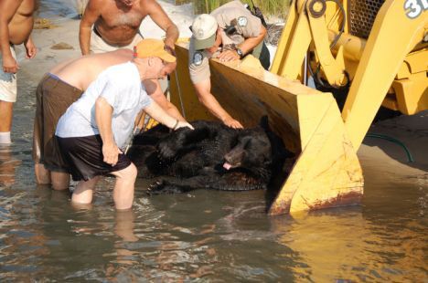 After watching the dramatic rescue effort unfold, local resident Thad Brett brought his digger to the beachfront to carry the bear away.