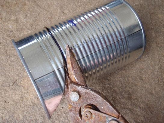 Remove the can lid completely from a 40-ounce (or similar sized) food can. You could use a smaller can, but the 40-ounce size because one-quart water bottles will nest inside the finished stove. Next, make a mark all the way around the can about 1 ½ inches below the open top. Use your tin snips, spiraling in, to cut this ring off the top of the can, but before you start, determine whether you are using right- or left-hand snips. It will be easier if you cut in the correct direction. You could leave the can full height, but I wouldn’t recommend it. A shortened stove has better balance, and the last thing you need is for your stove to tip over.