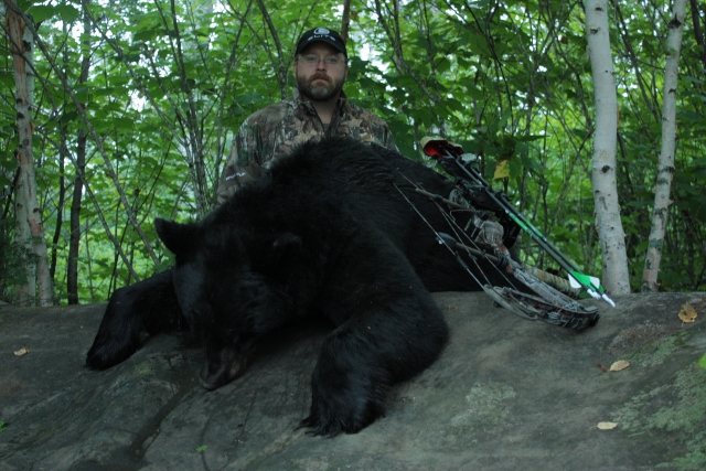 Our hunters are required to bring their own tree stands. This is not only for liability reasons, but, also because you will be more familiar with your own tree stand and the more at ease you are with equipment the more it will increase your odds – less to think about. Upon request we will setup ground stands for those that are not able to climb. If this is the case be sure to bring along a comfortable chair. Evening hours are by far the proven time to encounter bear on the bait. This however is simply a higher percentage timeframe. Approaching the bait cautiously is always a must due to the fact that hunters have stumbled upon bear contently feeding at all hours, including early morning and mid-day. You can bring along trail timers and cameras to satisfy your knowledge of the activity of your bait station.